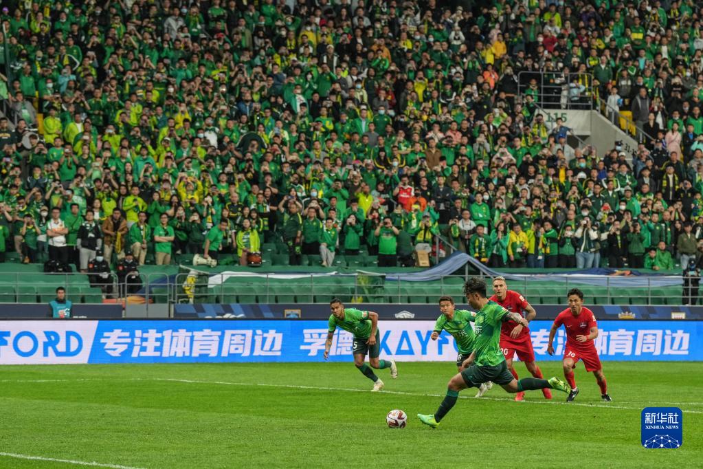 4月15日,北京国安队球员张稀哲(前)主罚点球得分。新华社记者 彭子洋 摄