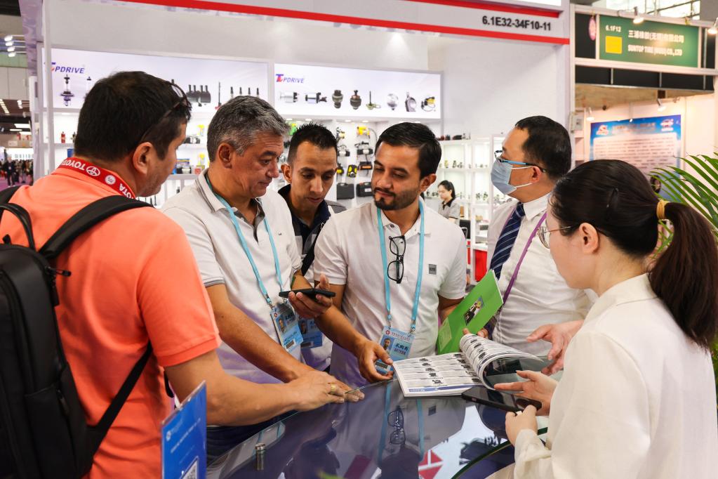 4月15日,几名来自哥伦比亚的采购商在广交会上了解中国汽配产品。新华社记者 刘大伟 摄