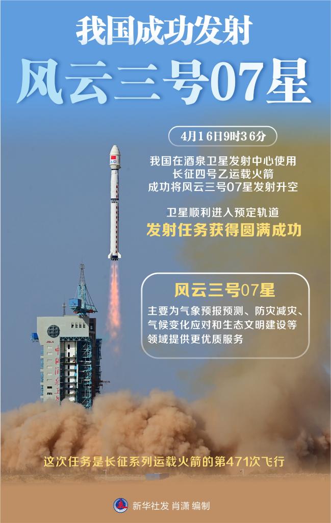 新华社酒泉4月16日电(李国利、郭龙飞)4月16日9时36分,我国在酒泉卫星发射中心使用长征四号乙运载火箭成功将风云三号07星发射升空,卫星顺利进入预定轨道,发射任务获得圆满成功。