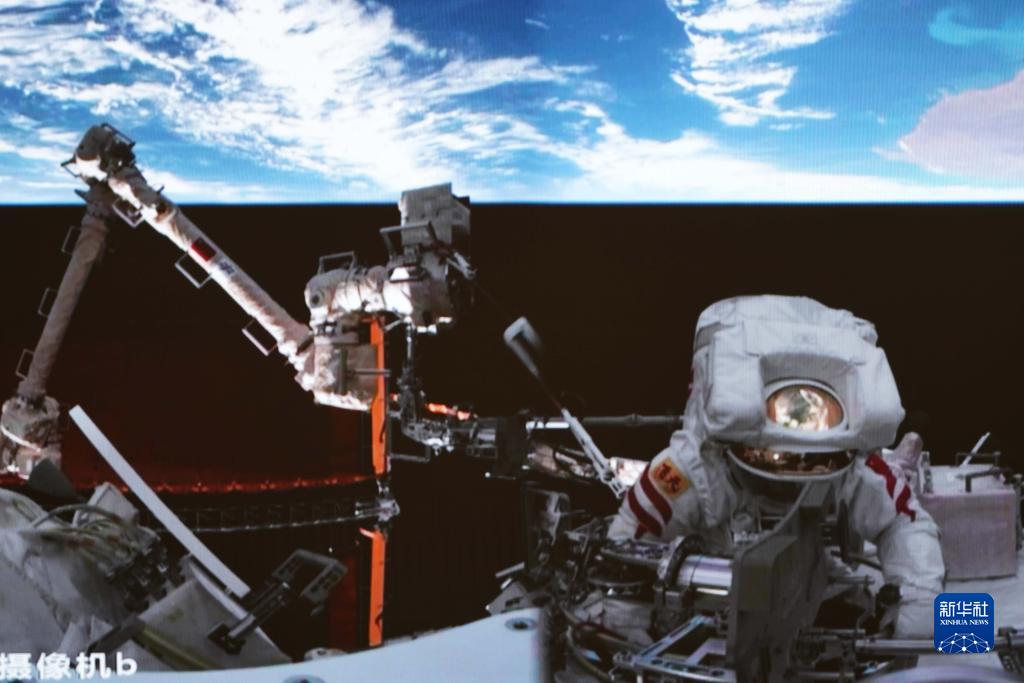 4月15日在北京航天飞行控制中心拍摄的神舟十五号航天员费俊龙成功出舱的画面。新华社记者 郭中正 摄