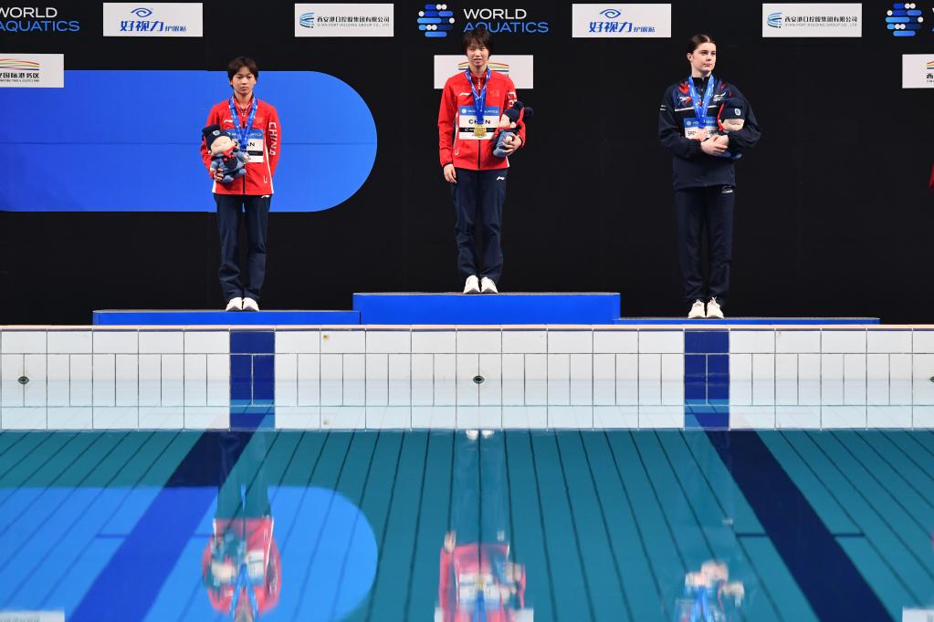 4月16日,冠军中国选手陈芋汐(中)、亚军中国选手全红婵(左)与季军英国选手西里埃在颁奖仪式上。新华社记者 张博文 摄