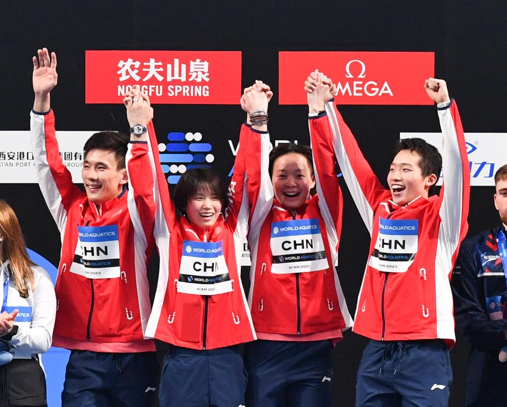 4月16日,中国队选手杨昊、陈芋汐、陈艺文、王宗源(从左至右)在颁奖仪式上。新华社记者 张博文 摄