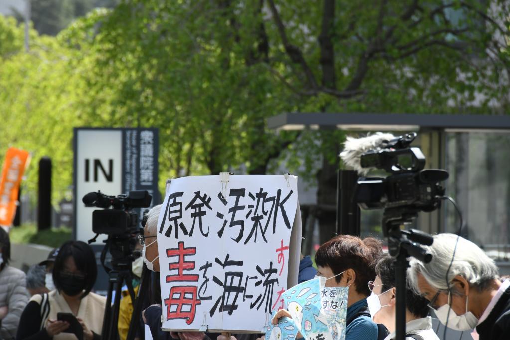2023年4月13日,在日本东京,民众手举标语在日本国会众议院第二议员会馆前参加集会,抗议日本政府推进核污染水排海计划。新华社记者 岳晨星 摄