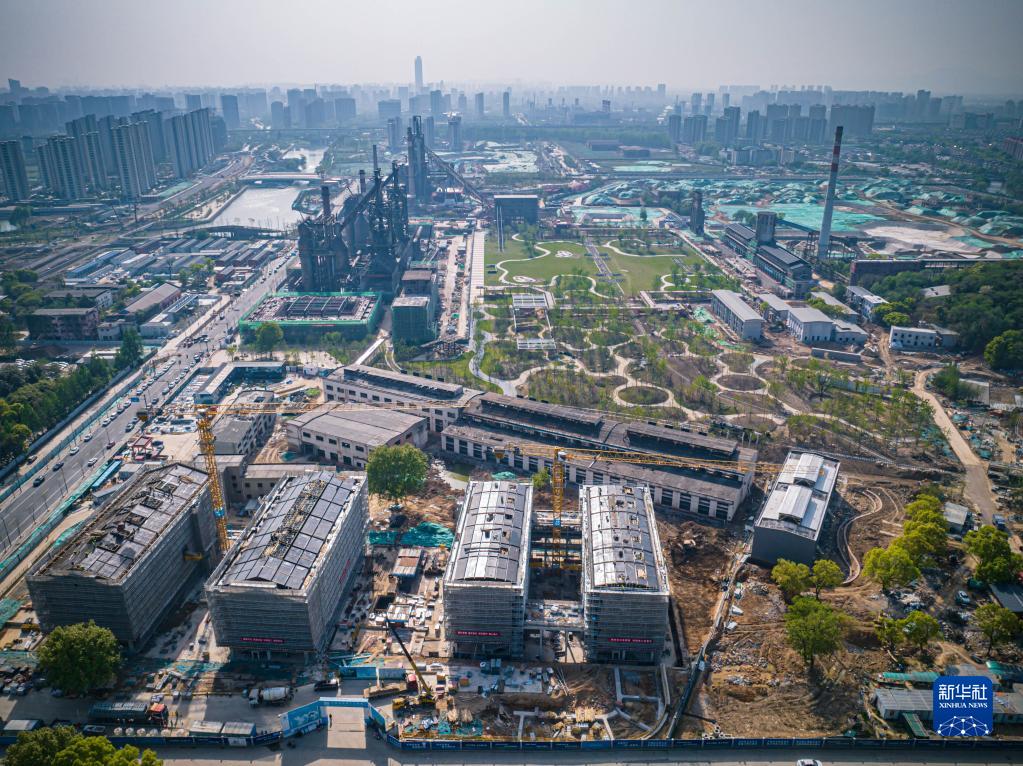 这是4月17日拍摄的建设中的杭钢工业旧址公园全景(无人机照片)。