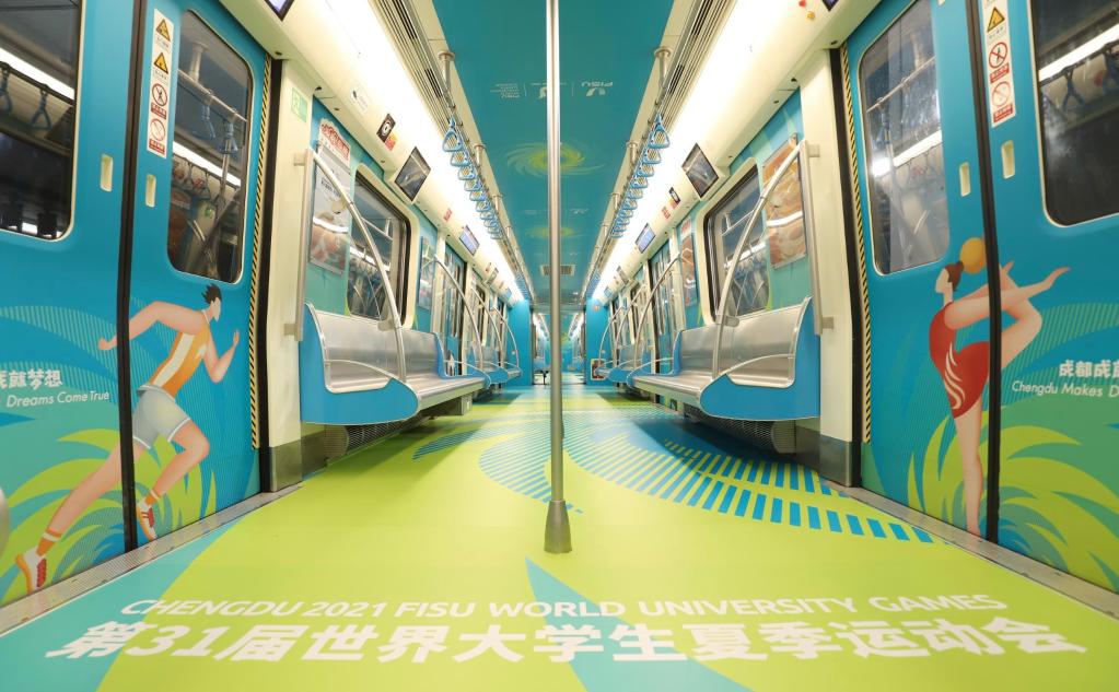 据了解,大运会倒计时100天主题列车根据成都大运会主视觉元素进行了定制化打造。主色调从大运会会徽延展而来,画面整体以朱红、明黄、翠绿、湖蓝四种颜色为基调。画面设计以“成都成就梦想”为主题,将“太阳神鸟”这一象征古蜀文明与天府文化的文化符号作为列车顶部及地面的主要视觉元素,表达出追求光明、团结奋进、和谐包容的精神寓意。