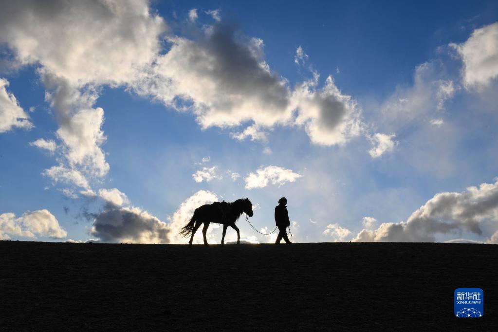 牧归时分,哈布得拉什么牵着马走在春草场的一处高坡上,观看羊群吃草的情况(4月12日摄)。他习惯提前找到羊群,然后等待至太阳下山,才将羊群缓缓赶回家。