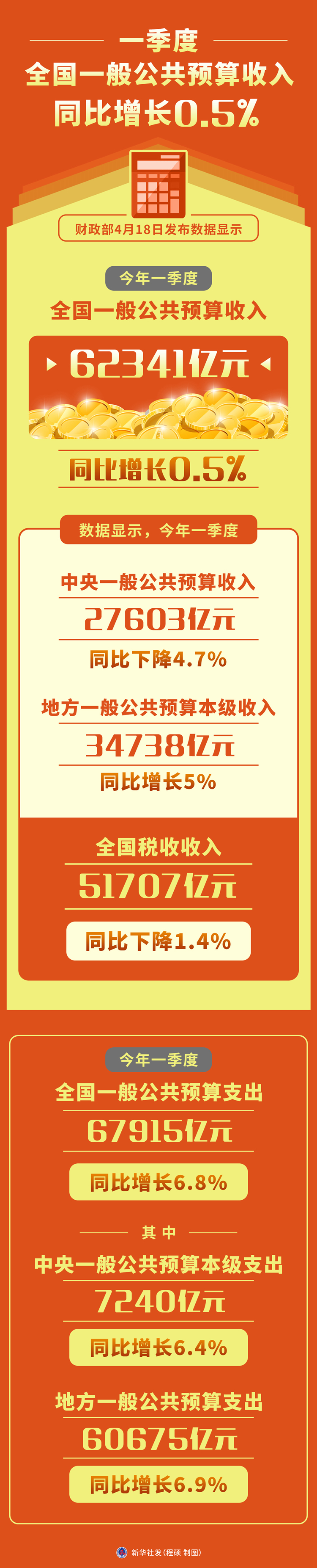 新华社北京4月18日电(记者申铖)财政部18日发布数据显示,今年一季度,全国一般公共预算收入62341亿元,同比增长0.5%。