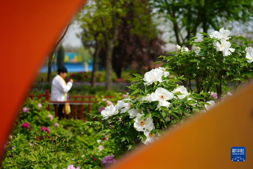 4月18日,游客在河北省柏乡县汉牡丹园游览。