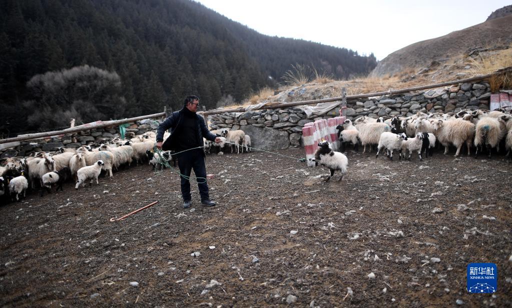 4月9日,在青海省海北藏族自治州祁连县扎麻什乡郭米村,牧民桑太才郎在羊圈中查看羊羔身体状况。