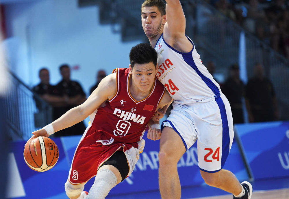 2019年7月11日,在意大利那不勒斯的第30届世界大学生夏季运动会男子篮球排位赛中,中国队球员张宁(左)在比赛中突破。新华社记者 孔卉 摄