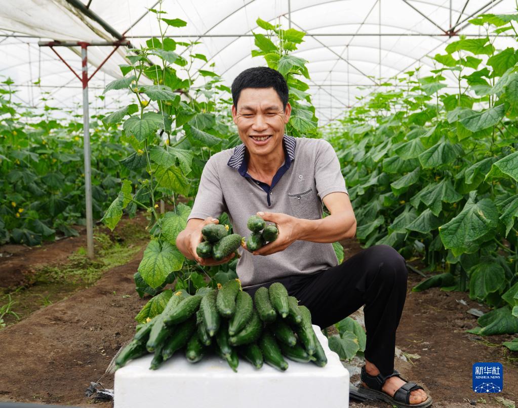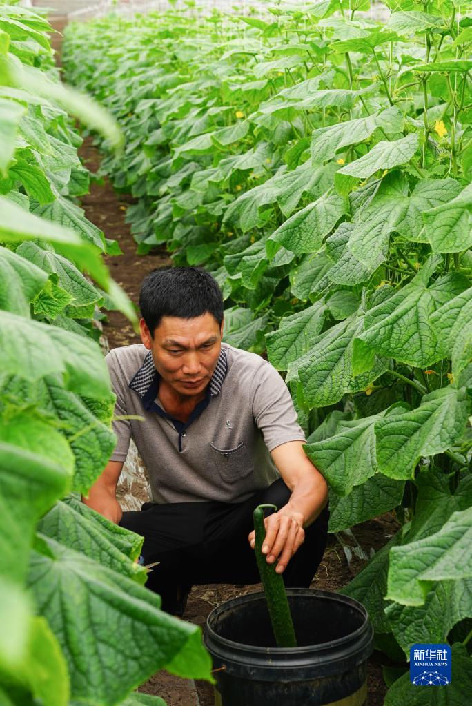 4月13日,在北海市银海区福成镇三合口村,邱福宁在大棚里采摘黄瓜。新华社记者 周佳谊 摄