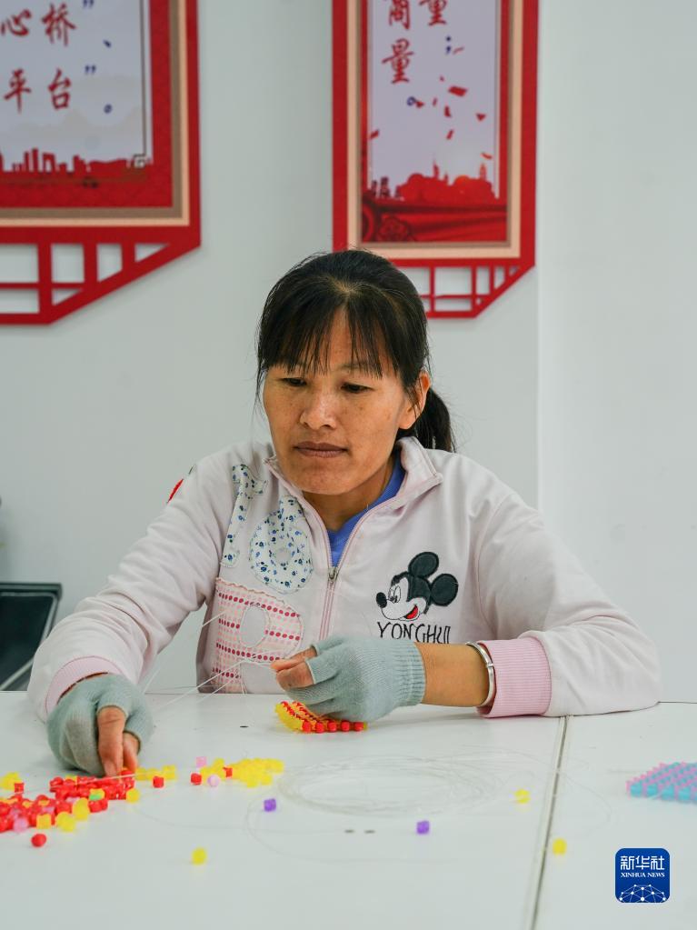 4月11日,罗彩芬在南宁市隆安县震东社区的“益起初发”助残公益创业就业基地制作手工艺品。新华社记者 周佳谊 摄
