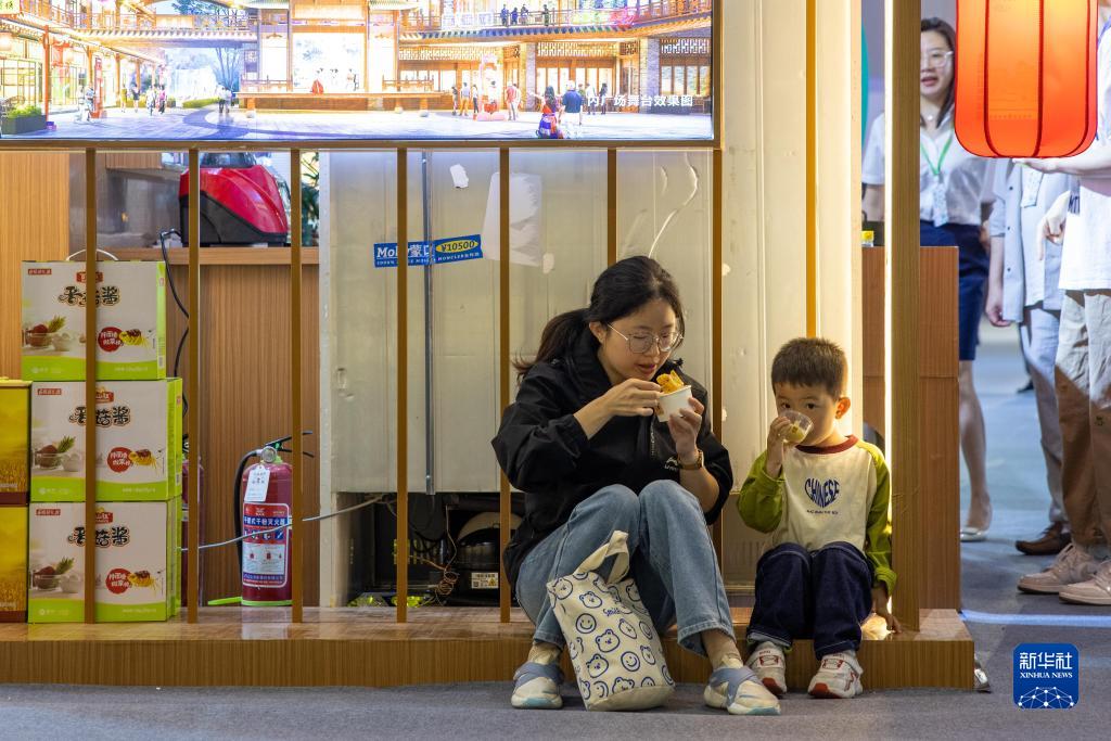 4月20日,一对母子在“味美浙江”餐饮消费欢乐季现场品尝美食。
