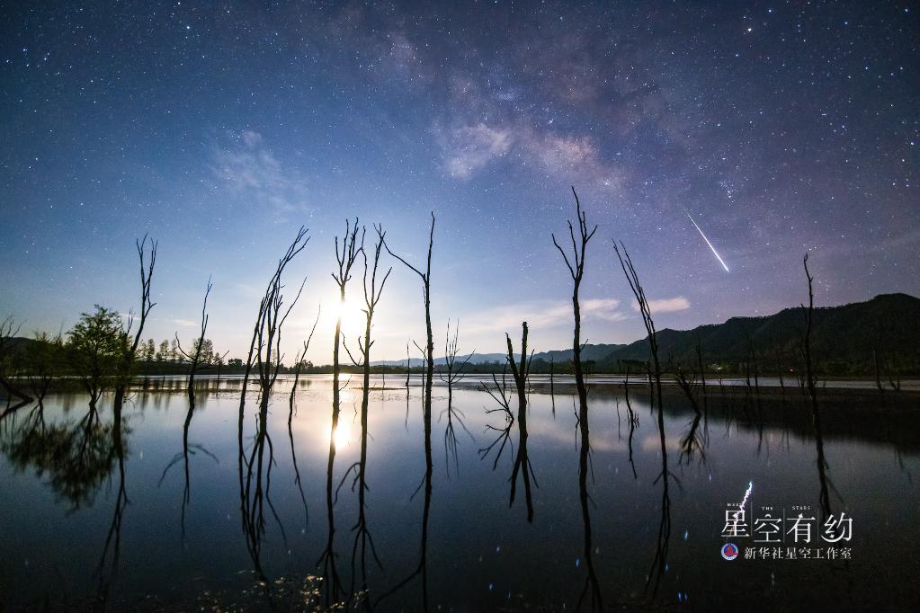 这是重庆市天文摄影爱好者戴建峰2022年4月23日在云南念湖拍摄的天琴座流星雨。(本人供图)