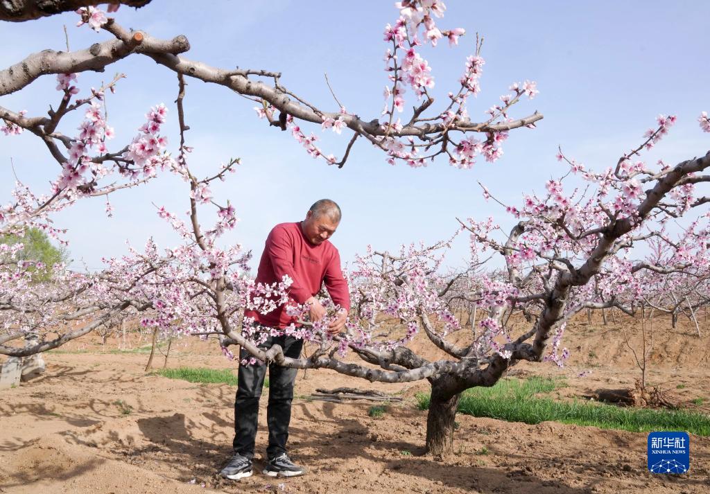 4月19日,农民在秦皇岛市山海关区孟姜镇一处桃园内疏花。