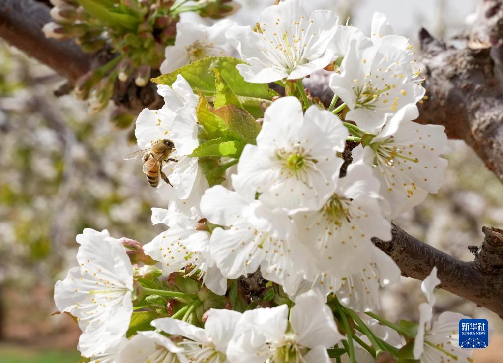 4月19日,在秦皇岛市山海关区石河镇一处樱桃园,蜜蜂落在鲜花上采蜜。