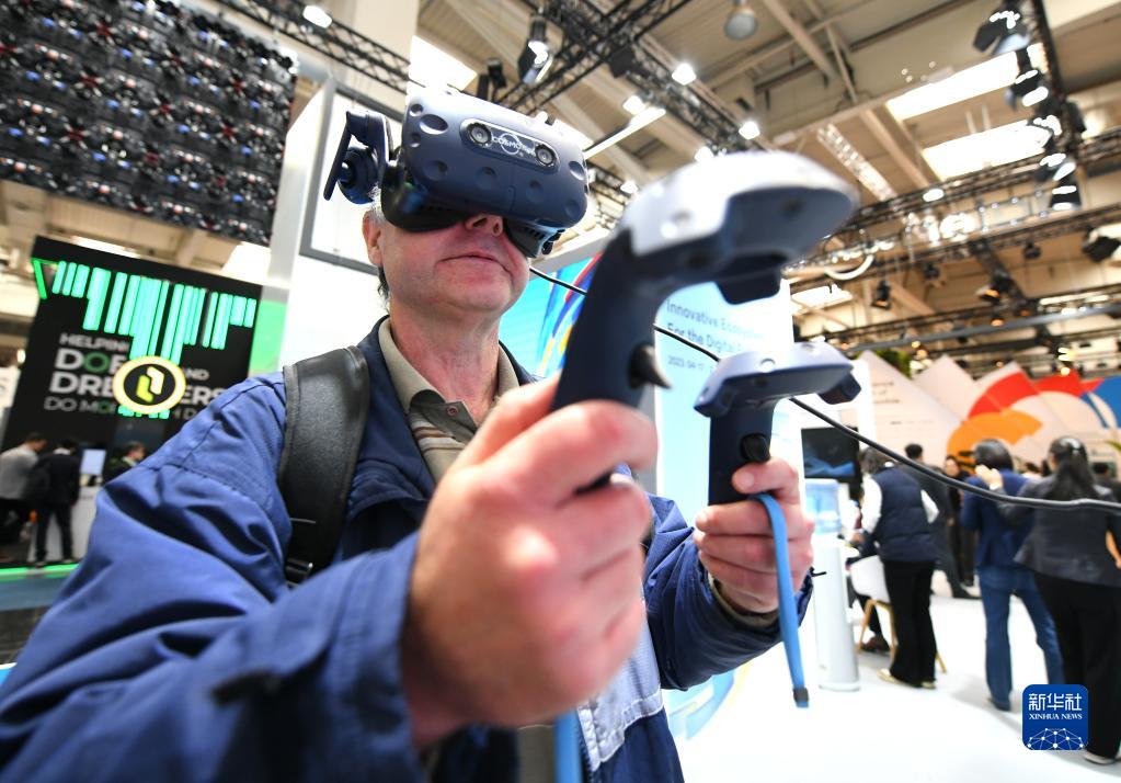 4月19日,在德国汉诺威工博会上,一名男子通过VR设备了解海尔卡奥斯工业互联网平台。