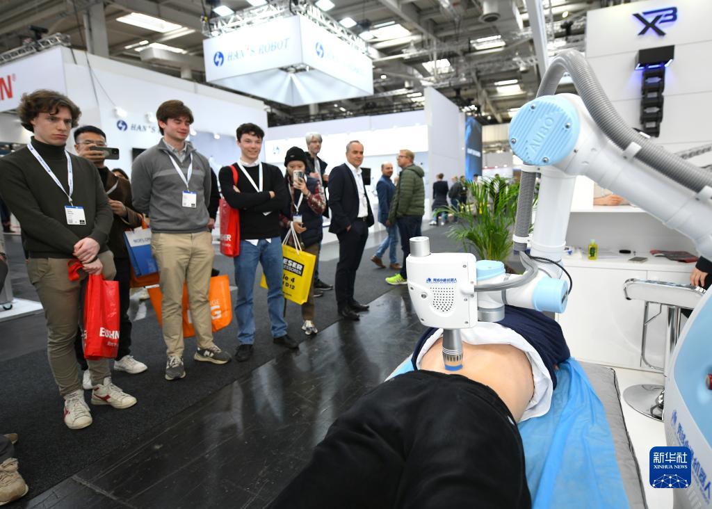 4月18日,在德国汉诺威工博会上,遨博协作机器人为一名男子理疗。