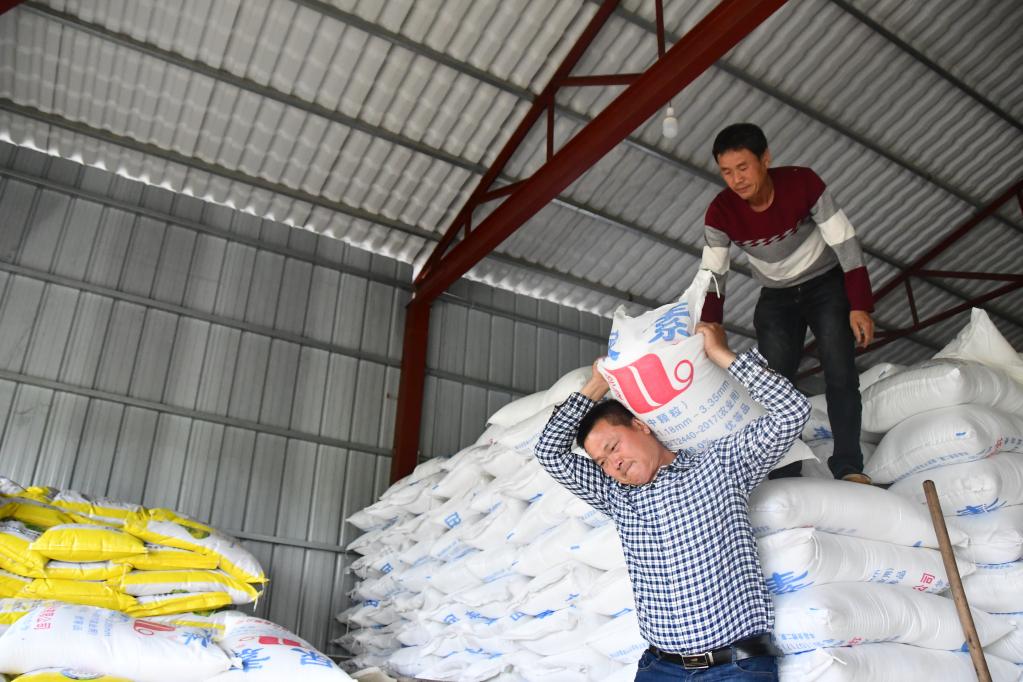 湖南省益阳市沅江市琼湖街道保民现代谷物种植合作社负责人王剑良(下)在搬运化肥。新华社记者周勉 摄