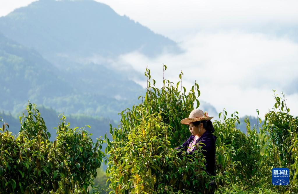 4月19日,重庆市南川区德隆镇茶树村,村民在山坡上的一处南川古树茶人工培育生产基地内采摘茶叶。