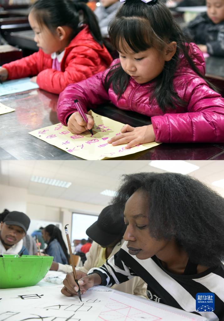 拼版照片:上图为2017年11月25日,小朋友在中国河南安阳的中国文字博物馆“甲骨学堂”上体验甲骨文的书写(新华社发 李嘉南 摄);下图为2023年4月18日,学生在肯尼亚内罗毕大学孔子学院举办的中文日活动上写毛笔字(新华社记者 韩旭 摄)。
