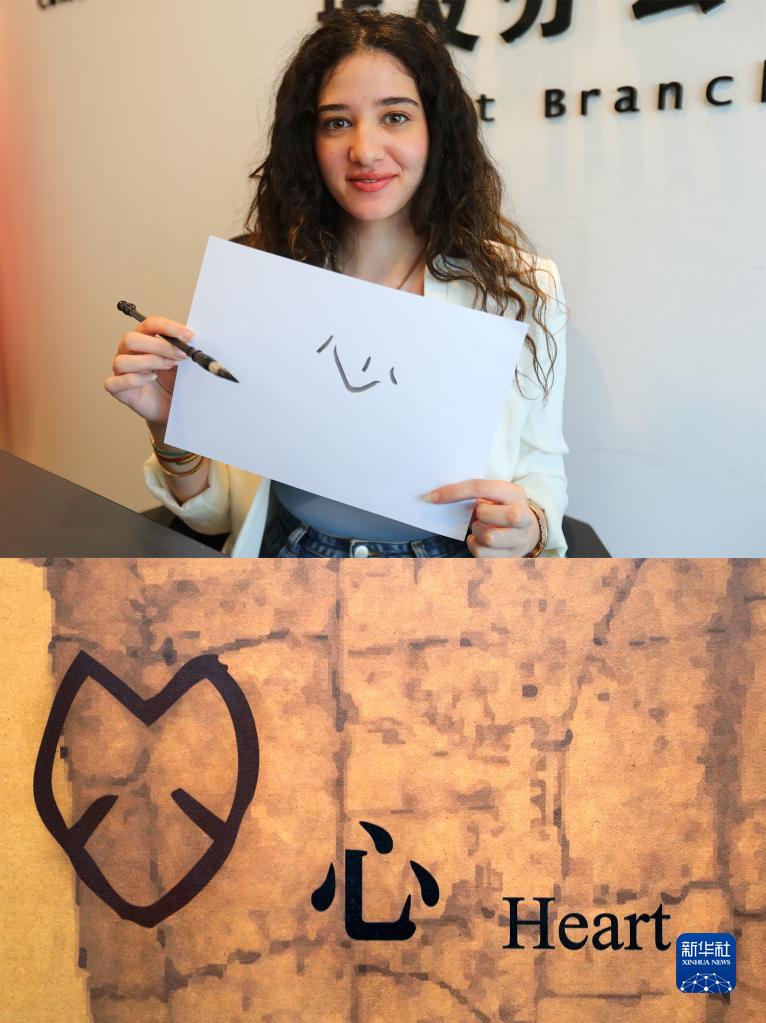 拼版照片:上图为2023年4月13日,在埃及开罗,阿斯玛·穆斯塔法·易卜拉欣展示用毛笔书写的“心”字(新华社记者 隋先凯 摄);下图为2023年4月19日在位于中国河南省安阳市的中国文字博物馆拍摄的“心”字甲骨文(左)(新华社记者 李安 摄)。