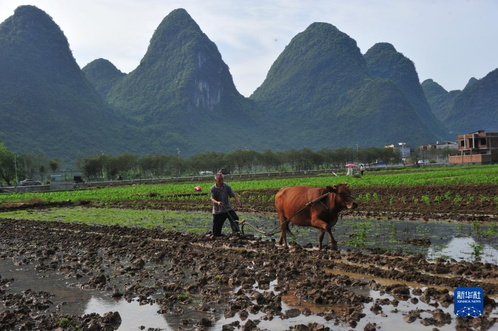 4月20日,广西河池市罗城县东门镇永安村大地卖屯农民在犁田。