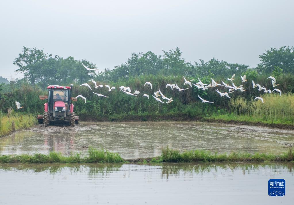 4月20日,在湖南省永州市道县梅花镇蒋莫村,农民驾驶农机翻耕水田。