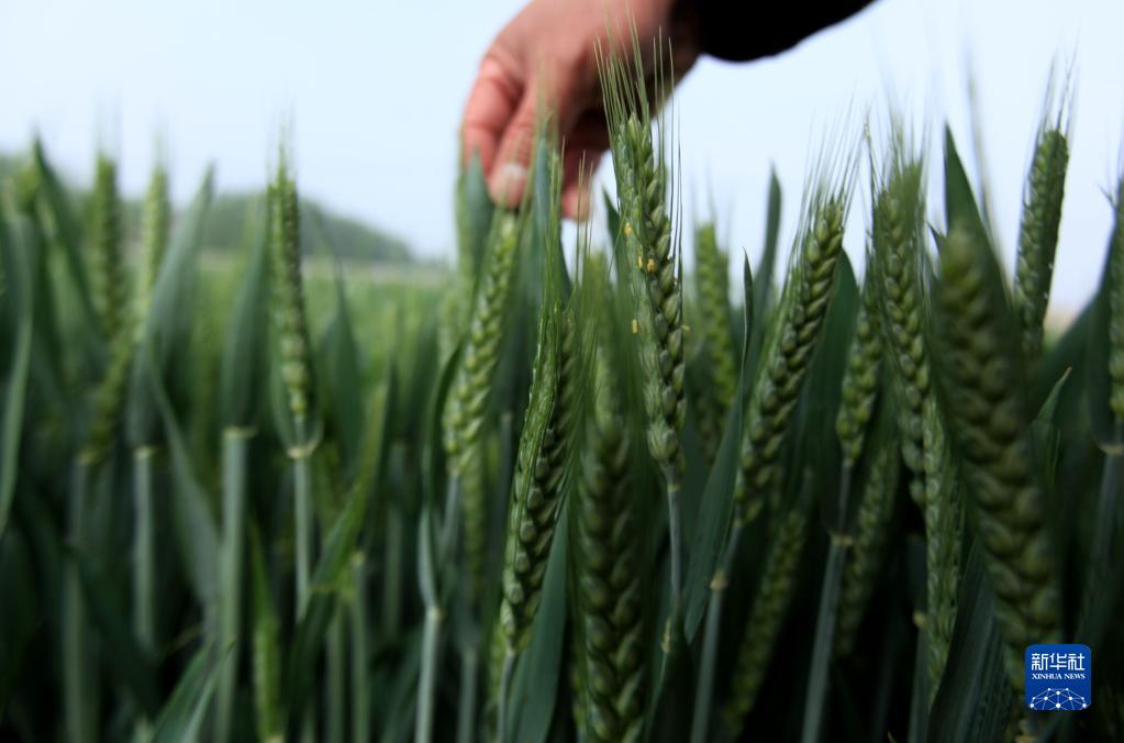 4月20日,山东省临沂市平邑县地方镇下坡村农民在查看进入抽穗扬花期的小麦长势。