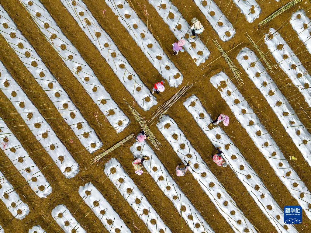 4月20日,农民在贵州省安顺市西秀区旧州镇浪塘村田间搭建冬瓜架(无人机照片)。
