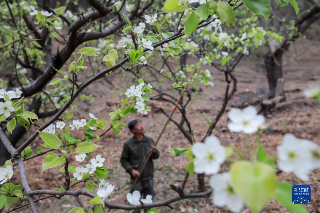 4月20日,河北省迁西县上营镇农民在果园劳作。