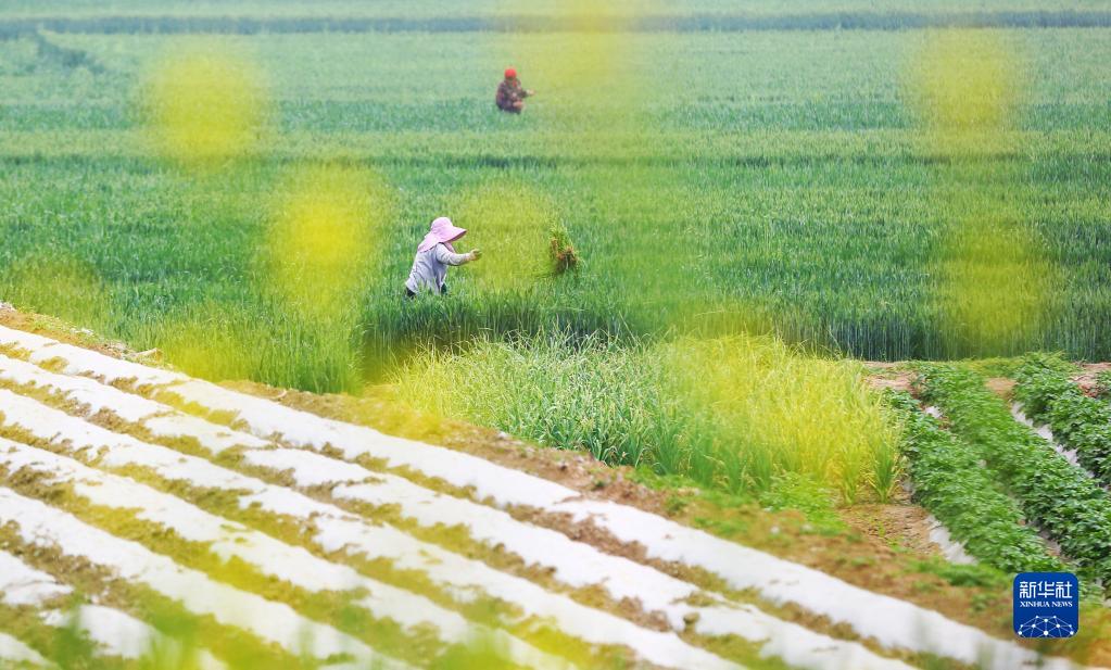 4月20日,农民在山东省滕州市级索镇麦田里拔草。