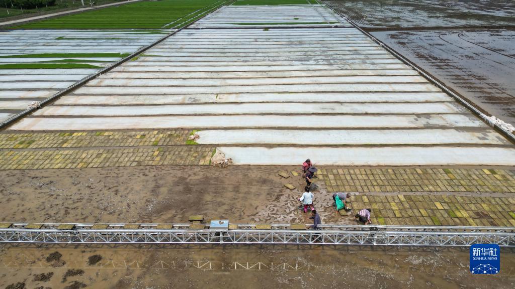 4月20日,在彭山区公义镇,数智水稻示范基地内的工人在田里育秧(无人机照片)。