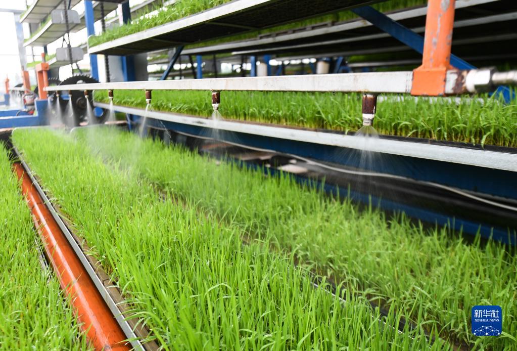 4月20日,在彭山区公义镇的数智水稻示范基地,循环式智能育秧机给秧苗补水。
