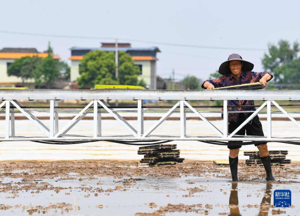 4月20日,在彭山区公义镇的数智水稻示范基地,工人在秧盘智能传输带上转运育秧盘。