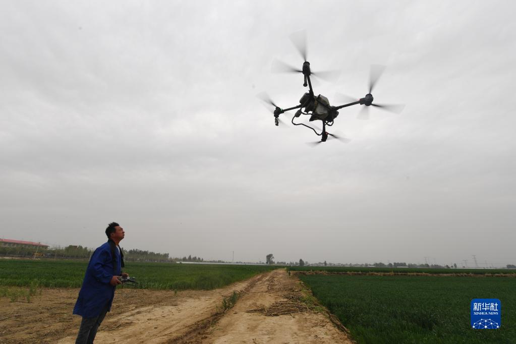 4月20日,张战强操作植保无人机开展麦管作业。