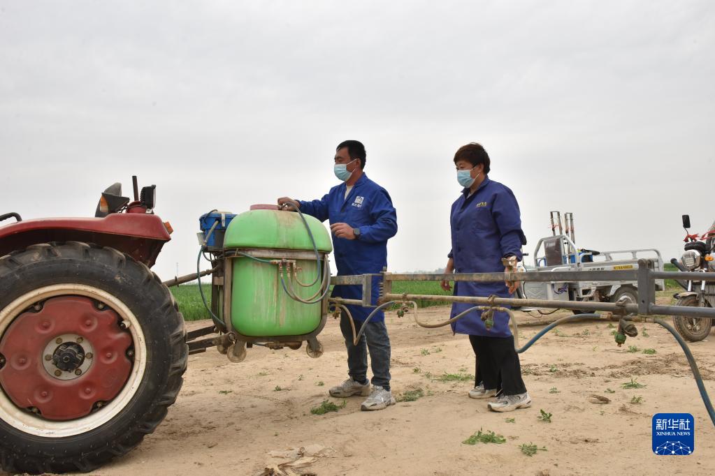 4月20日,张战强夫妇在调试喷药机。