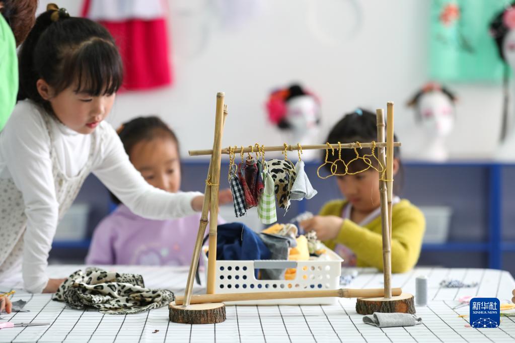 4月20日,小朋友们在给木偶玩具制做服饰。