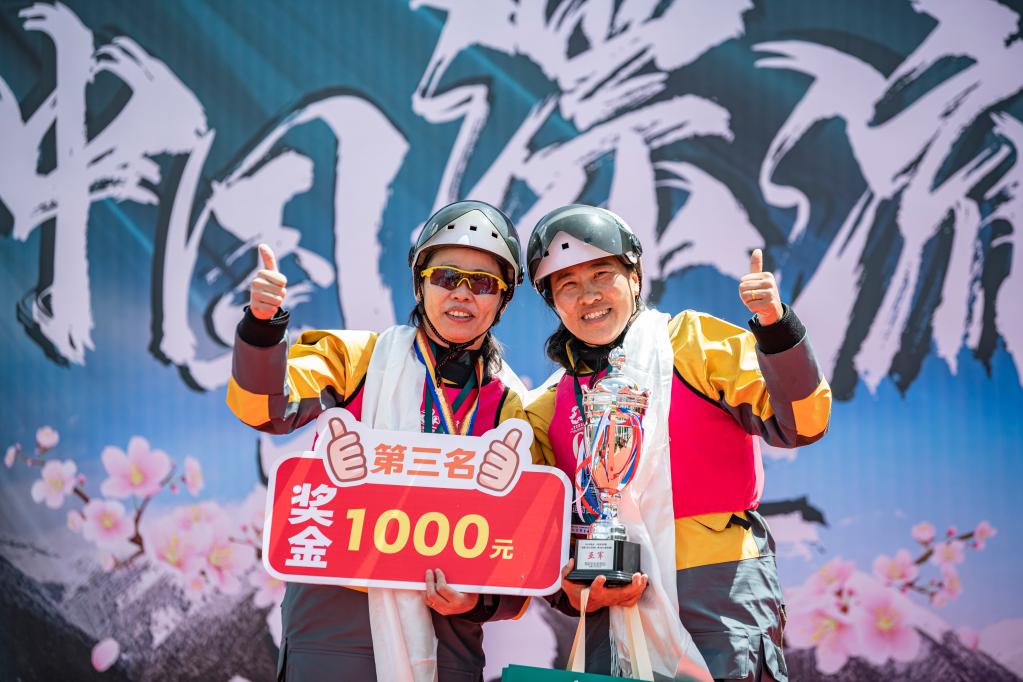 钟红艳(左)和何静在双人漂流艇竞速赛颁奖仪式上(4月15日摄)。新华社记者 孙非 摄