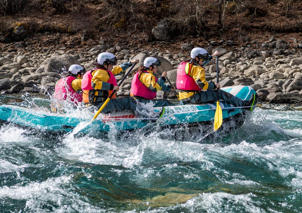 四姐妹在漂流筏追逐赛中(4月16日摄)。新华社记者 孙非 摄