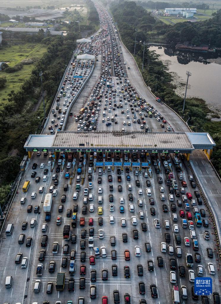 4月19日,印度尼西亚加拉璜一处道路收费站排起长龙(无人机照片)。