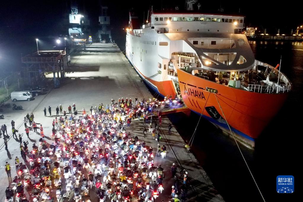 4月19日,骑摩托车返乡的民众在印度尼西亚万丹省芝勒贡登上轮渡(无人机照片)。