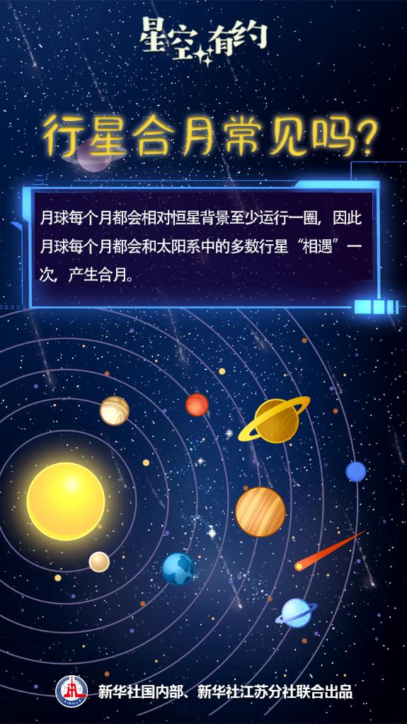“行星合月是一种比较常见的天象,每个月都会发生多场。”王科超解释说,月球每个月都会相对恒星背景至少运行一圈,因此月球每个月都会和太阳系中的多数行星“相遇”一次,产生合月。