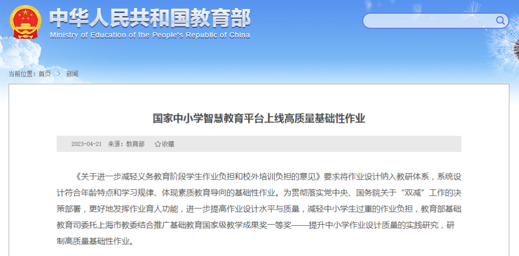 记者4月21日从教育部获悉,为更好地发挥作业育人功能,进一步提高作业设计水平与质量,减轻中小学生过重的作业负担,日前,48册基础性作业已在国家中小学智慧教育平台上线,供广大师生免费使用。