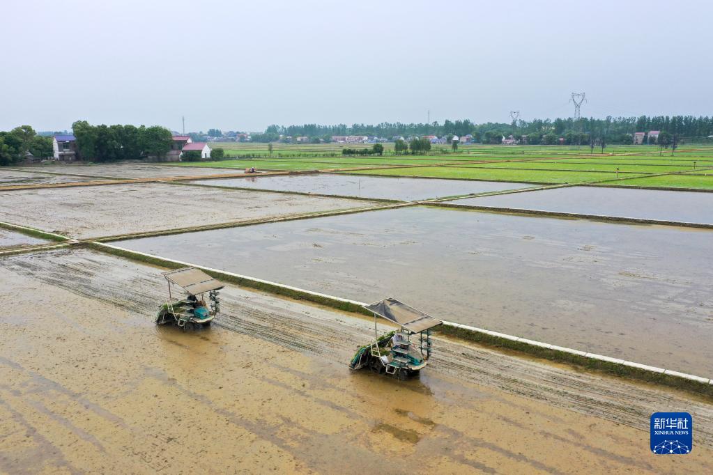 春耕时节,湖南省益阳市赫山区中塘村农民抢抓农时,将育好的水稻秧苗移栽入大田。旋耕机、插秧机在田间作业,无人机实施自动化施肥打药,机械化作业助力春耕,为早稻丰产打下基础。