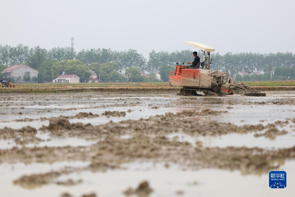 4月21日,在湖南省益阳市赫山区中塘村,农民驾驶农机在田间作业。