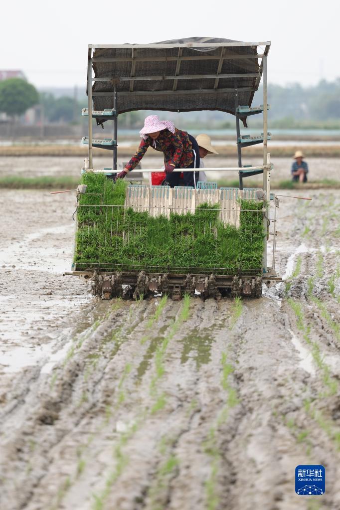 4月21日,在湖南省益阳市赫山区中塘村,农民驾驶插秧机进行水稻插秧作业。