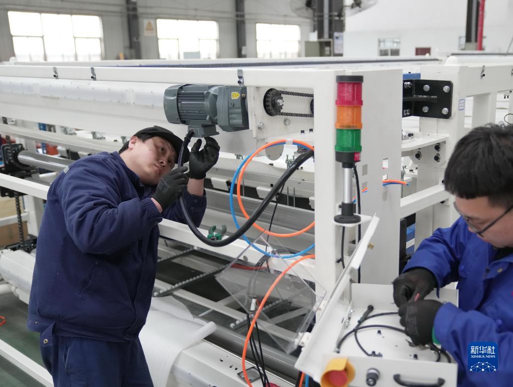 4月21日,工人在秦皇岛市海港区一家光伏板制造设备企业的生产车间工作。