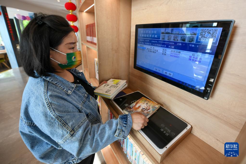 一名市民在张家港市益空间·湖畔书房内通过自助借还书系统借阅图书(4月20日摄)。