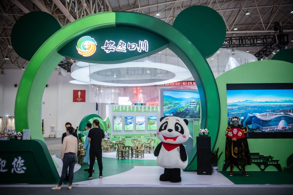 憨态可掬的大熊猫人偶站在“安逸四川”展馆前,迎接过往游客。展馆顶部是一幅徐徐展开的卷轴,展示苏东坡诗歌文化,馆内还有天府旅游美食造型艺术墙、文创展示、非遗互动等。“希望全国各地的游客都来我们四川感受天府之国、安逸四川、熊猫家园、古蜀文明四大名片。”四川馆工作人员吕阳峰说。